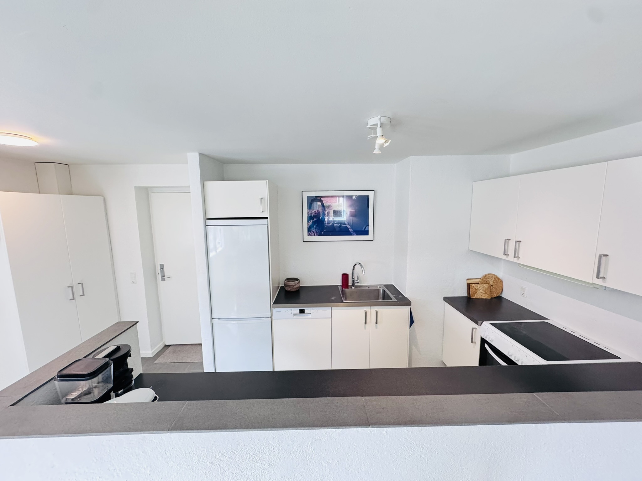 In the induction open plan kitchen, refrigerator, microwave, oven, freezer, dishwasher, dishes/cutlery, kitchen utensils, coffee machine, toaster, kettle and kitchenware are provided.
